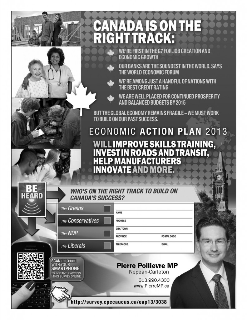 We are sending out our newest flyer on “Building Canada’s Success” to residents of Nepean-Carleton. If you live in the riding of Nepean-Carleton, you should be receiving this flyer likely between April 26, 2013 – May 3, 2013. Please check your mailboxes and let us know if you have received this newest communication piece – www.pierremp.ca/contact.